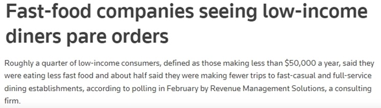 咨詢公司“收入管理解決方案”此前發(fā)布的一項(xiàng)民調(diào)結(jié)果顯示,年收入在5萬美元以下的美國人中,約有四分之一的人減少了快餐消費(fèi)。
