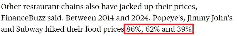 美國哥倫比亞廣播公司網(wǎng)站: 2014年至2024年間,“大力水手”“吉米·約翰”和“賽百味”的產(chǎn)品價(jià)格分別上漲了86%、62%和39%。