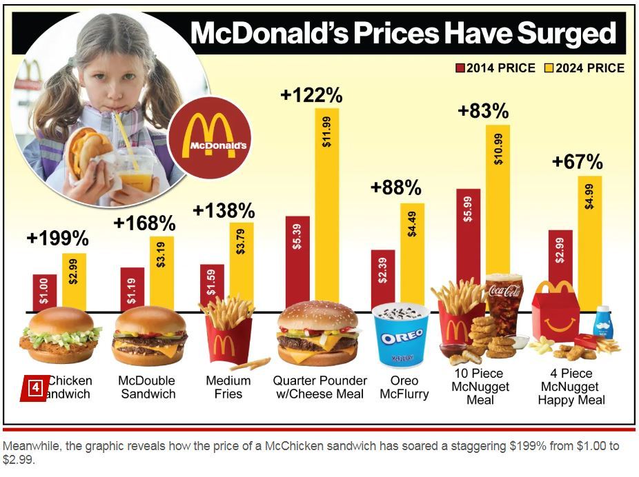 以麥當(dāng)勞經(jīng)典單品雙吉漢堡為例,2014年的平均價(jià)格為1.19美元,現(xiàn)在卻賣到3.19美元,漲價(jià)幅度高達(dá)168%。