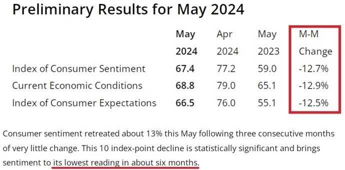 密歇根大學(xué)的最新調(diào)查顯示,由于預(yù)期通脹率和利率都將維持在高位,美國5月消費(fèi)者信心指數(shù)(CSI)在連續(xù)三個月幾乎持平后較上月大幅回落了約13%,降至約半年來的最低水平。