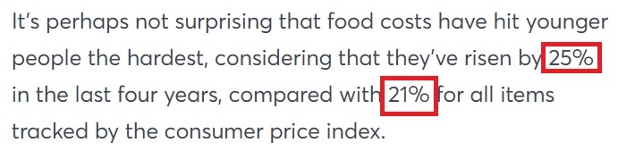 事實(shí)上,“食品通脹率”已經(jīng)超過了整體通脹率:過去四年,食品價(jià)格上漲了25%,而所有商品的價(jià)格平均漲幅為21%。