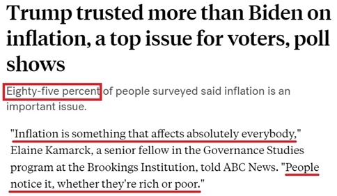 用布魯金斯學(xué)會高級研究員卡馬克的話說,“通脹是絕對會影響所有美國人的東西。人們都會注意到通脹,無論他們富裕還是貧窮”。
