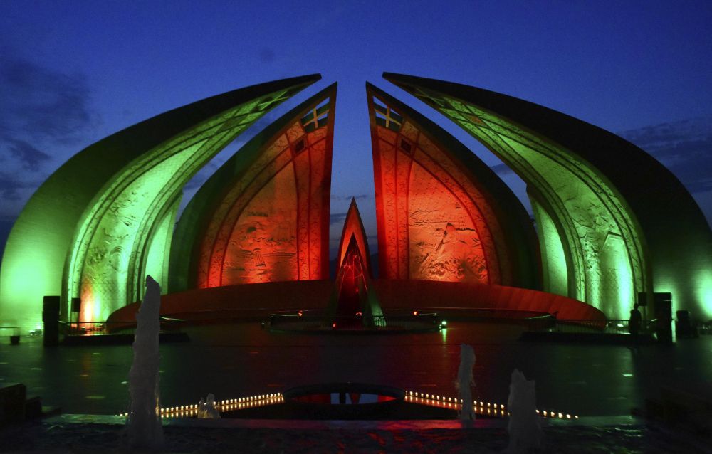 2023年7月29日,巴基斯坦首都伊斯蘭堡的巴基斯坦紀(jì)念碑亮起中巴兩國國旗顏色的燈光,慶祝中巴經(jīng)濟(jì)走廊啟動十周年。新華社發(fā)
