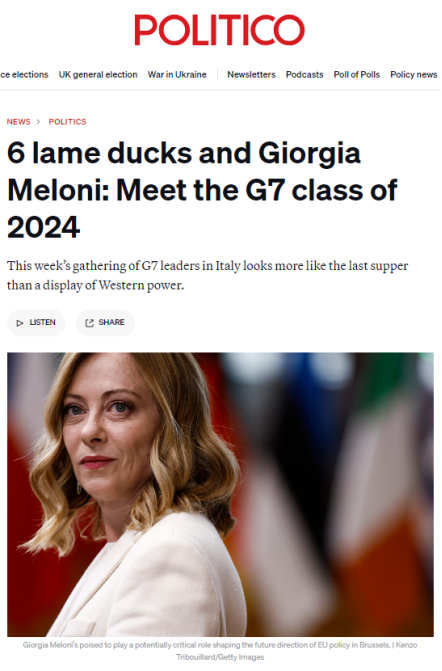 面對各自國內(nèi)嚴峻的政治形勢,本次G7峰會開得真有些力不從心、心猿意馬。法德兩國領導人所在政黨在上周剛剛結束的歐洲議會選舉中表現(xiàn)堪憂;英國首相蘇納克更在朝不保夕中擔憂著自己的保守黨會在下月初大選中走到窮途末路;美國總統(tǒng)拜登更是處處遭逢著大選對手特朗普的咄咄逼人。美國政客新聞網(wǎng)歐洲版(Politico.eu)捕捉到了這種有趣的心不在焉的會議氛圍,以《六只跛腳鴨和梅洛尼》為題諷刺總結本次峰會,“在意大利舉行的七國集團峰會看起來更像是最后的晚餐,而不是西方力量的展示”。