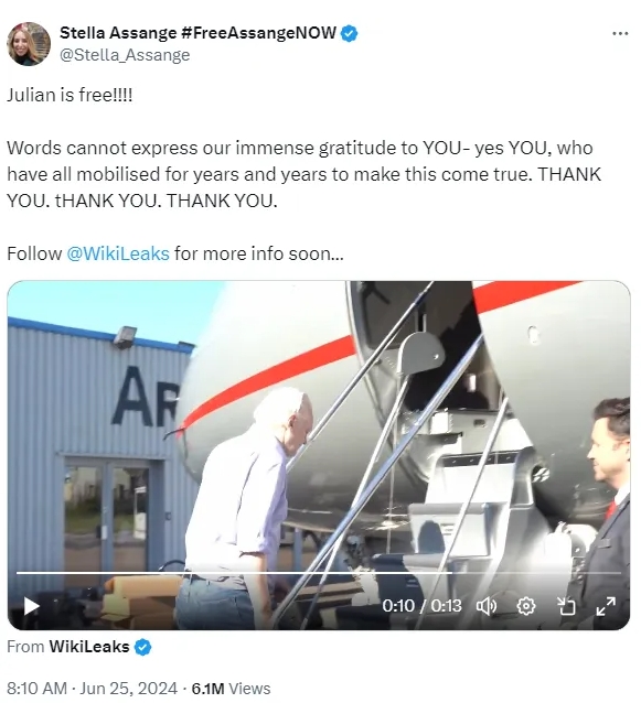 當(dāng)?shù)貢r間25日,朱利安·阿桑奇的妻子斯特拉在社交媒體上激動地寫道,“言語無法表達(dá)我們對你們的感激之情——是的,就是你們,多年來,你們一直努力讓這一切成為現(xiàn)實(shí)。謝謝你們。謝謝你們,謝謝你們?!?/p>