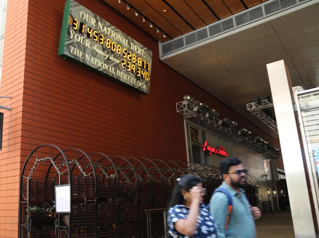 2023年5月29日,人們經(jīng)過(guò)美國(guó)紐約曼哈頓的“國(guó)債鐘”。“國(guó)債鐘”是一個(gè)大型計(jì)數(shù)器,它實(shí)時(shí)更新美國(guó)的公共債務(wù)總額,并顯示出每個(gè)美國(guó)家庭所要負(fù)擔(dān)的數(shù)額。 新華社記者劉亞南攝