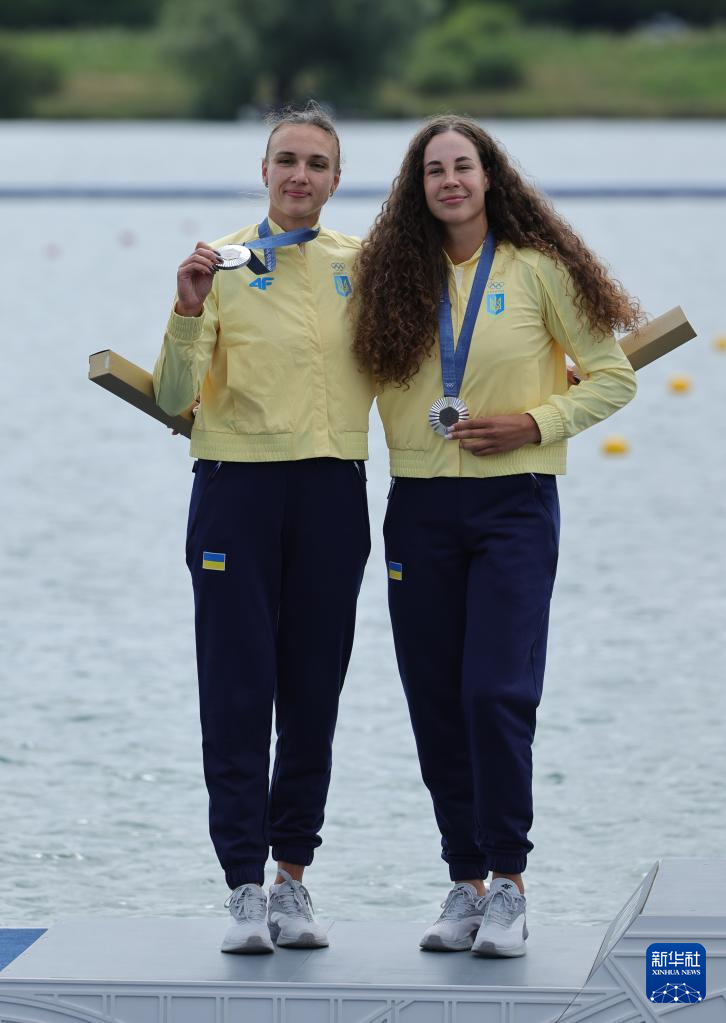 8月9日,亞軍烏克蘭組合柳德米拉·盧然(右)/阿納斯塔西婭·切特維里科娃在頒獎(jiǎng)儀式上。新華社記者 沈伯韓 攝