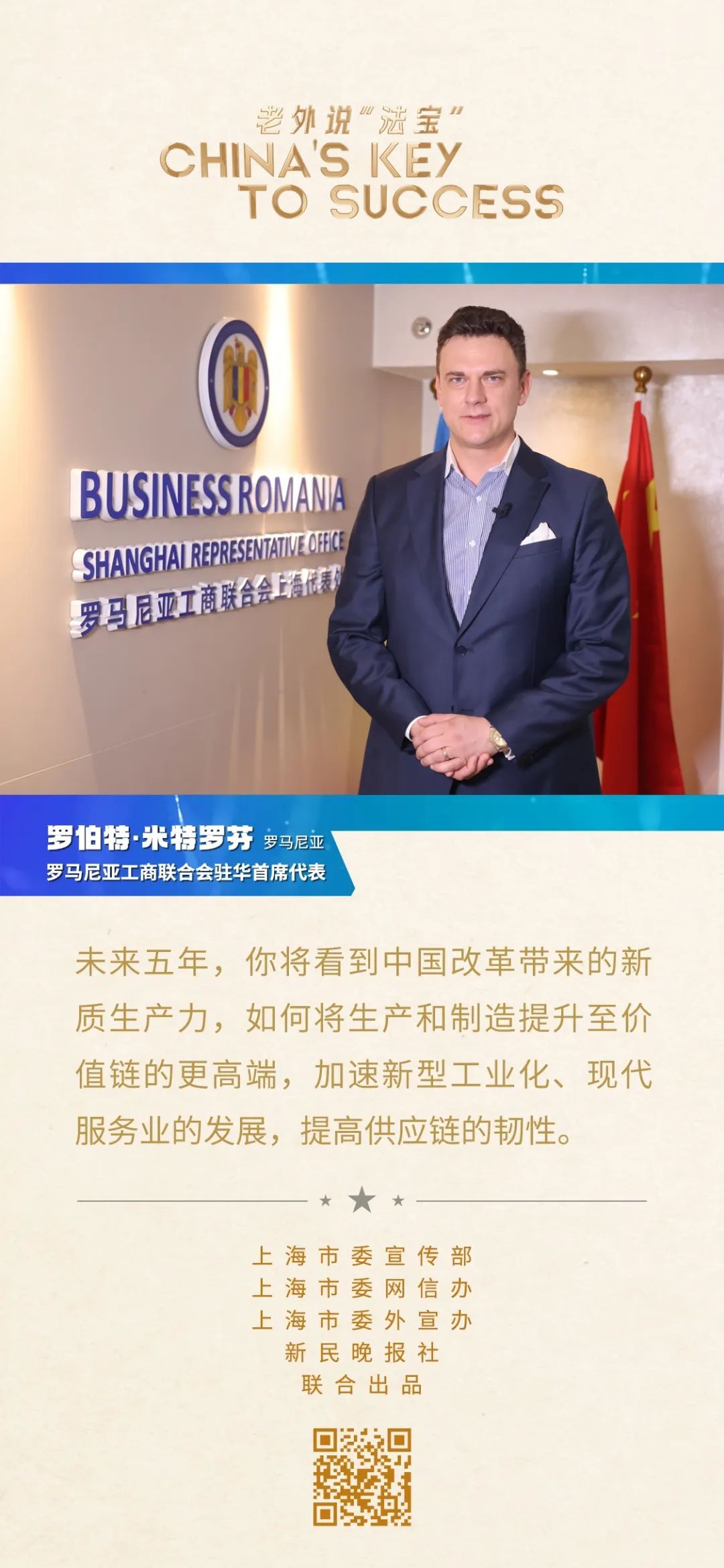 羅伯特·米特羅芬是羅馬尼亞工商聯(lián)合會(huì)駐華首席代表。2010年,他以羅馬尼亞國(guó)家館工作人員的身份來滬參加上海世博會(huì),那次的旅程讓他深深愛上了這座城市。從那時(shí)起,他就在上海定居。