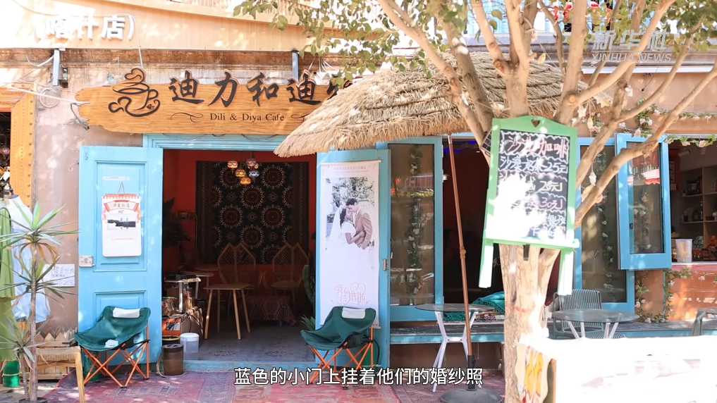 咖啡館木制的門頭雕刻著夫妻倆的名字,藍(lán)色的小門上掛著他們的婚紗照,照片里的海迪雅來(lái)自非洲東部坦桑尼亞桑給巴爾島,迪力夏提是新疆喀什本地人。