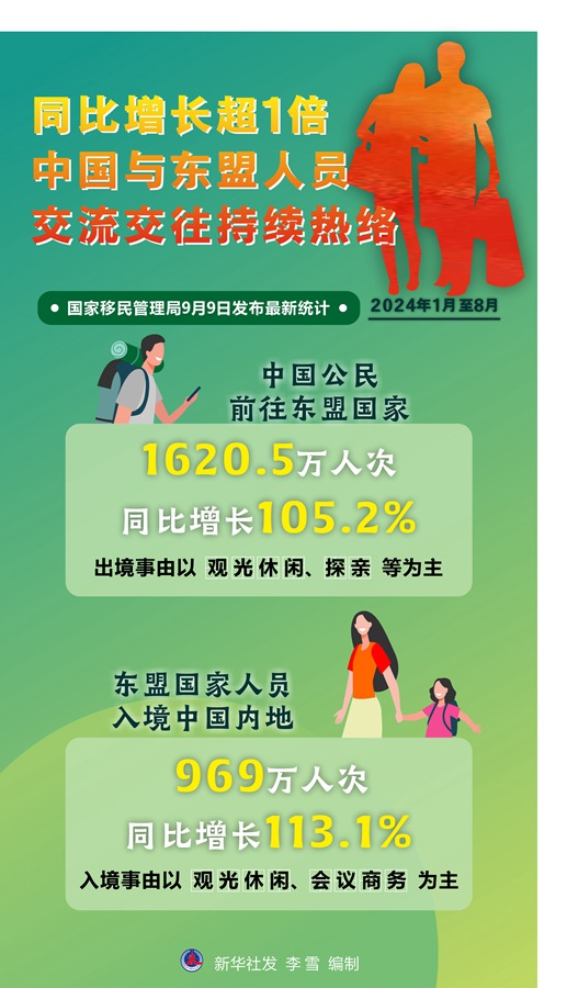 國(guó)家移民管理局9日發(fā)布最新統(tǒng)計(jì),2024年1月至8月,中國(guó)公民前往東盟國(guó)家1620.5萬人次,同比增長(zhǎng)105.2%,出境事由以觀光休閑、探親等為主;東盟國(guó)家人員入境中國(guó)內(nèi)地969萬人次,同比增長(zhǎng)113.1%,入境事由以觀光休閑、會(huì)議商務(wù)為主。