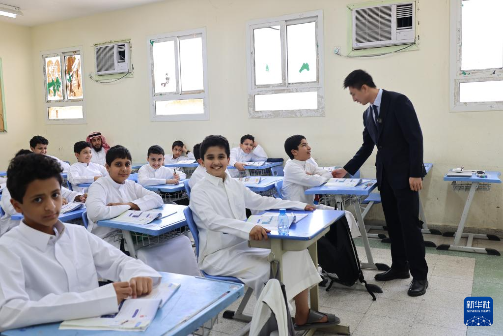 “你好”“老師好”……在沙特阿拉伯首都利雅得北部的一所中學(xué),17名身著阿拉伯白袍的學(xué)生正跟著中文老師史肖一遍遍誦讀著新學(xué)到的內(nèi)容,讀書聲里洋溢著快樂。