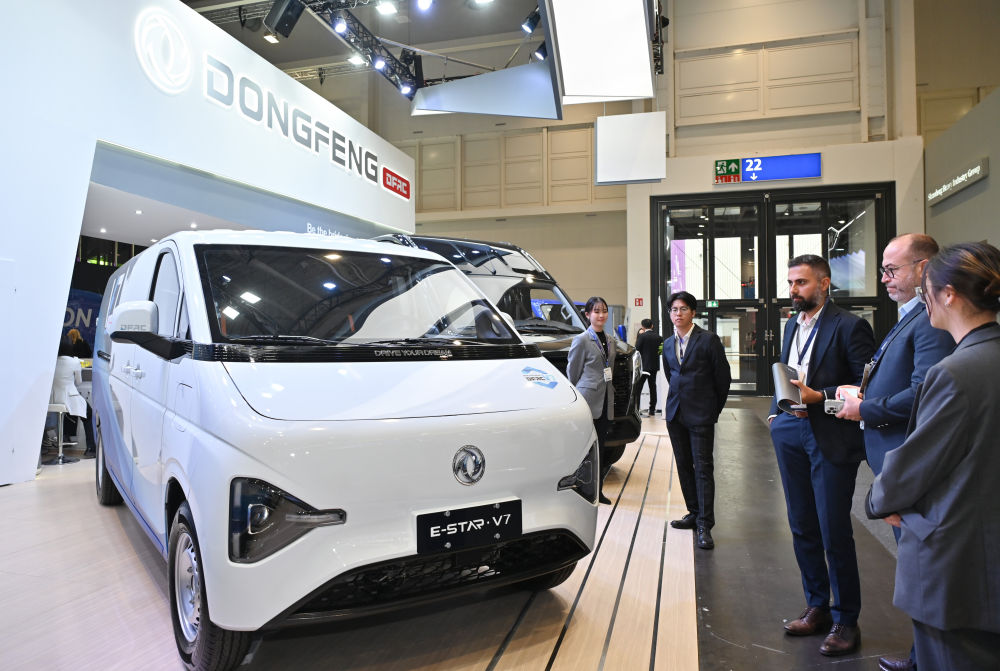 9月16日,在德國漢諾威國際交通運輸博覽會媒體預展上,人們在東風汽車展區(qū)參觀E-STAR V7商用車。新華社記者任鵬飛攝