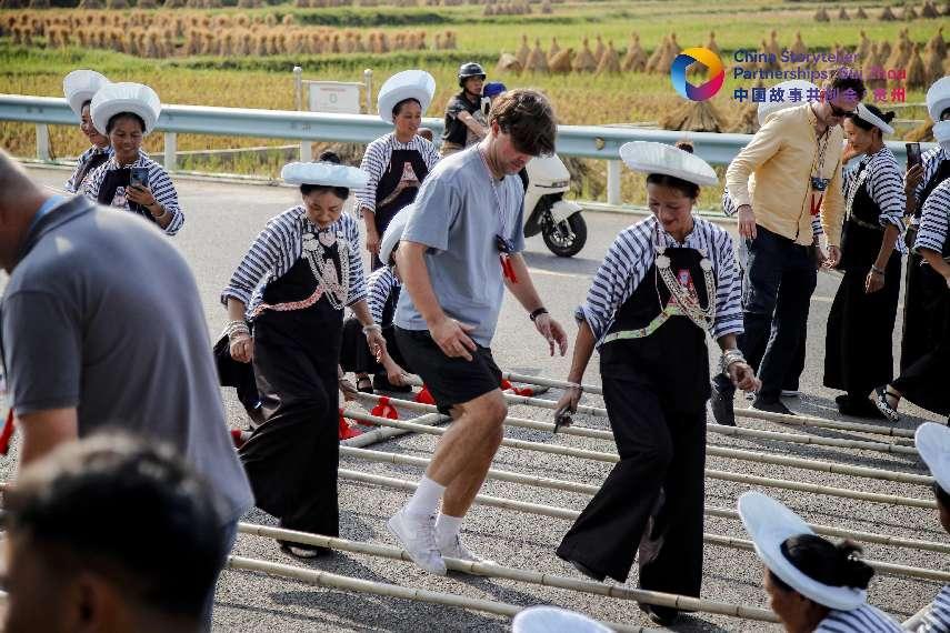 外籍自媒體人與布依族同胞同跳竹竿舞