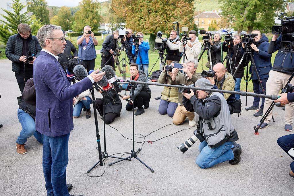 9月29日,奧地利自由黨領袖赫伯特·基克爾在奧地利下奧州的一處投票站投票后接受媒體采訪。新華社發(fā)(喬治斯·施耐德攝)
