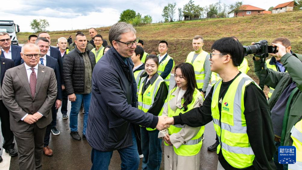 10月4日,在塞爾維亞中部城市上米拉諾瓦茨,塞爾維亞總統(tǒng)武契奇(中)在出席中企承建的繞城公路通車儀式時與項目建設(shè)者握手。新華社發(fā)(王韡攝)