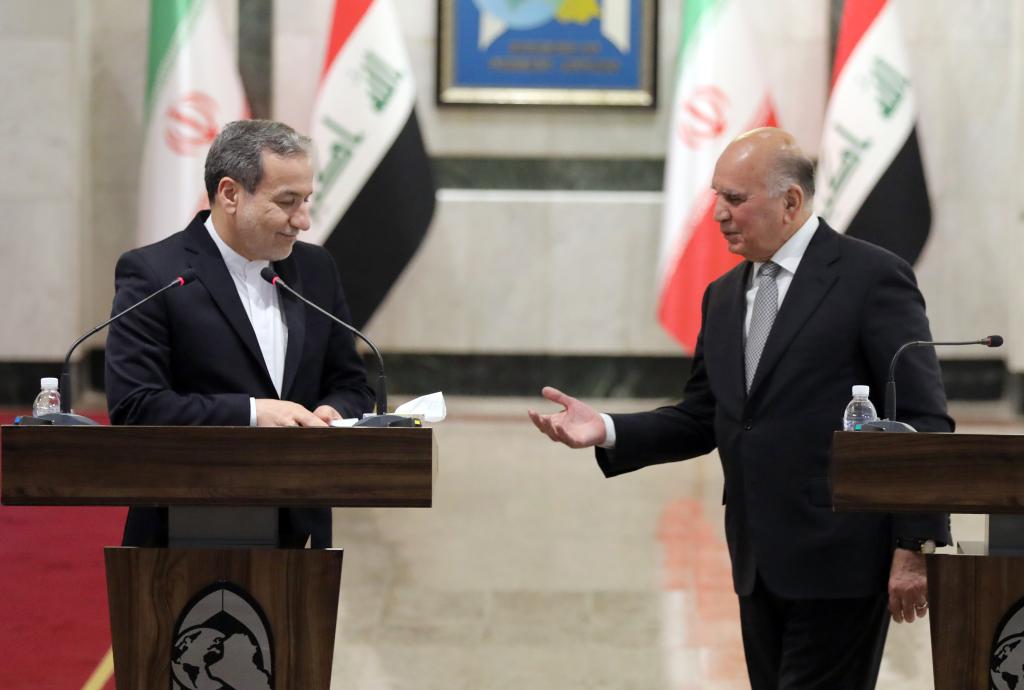 10月13日,伊拉克外長(zhǎng)侯賽因(右)同到訪的伊朗外長(zhǎng)阿拉格齊在首都巴格達(dá)舉行會(huì)談后參加聯(lián)合記者會(huì)。新華社發(fā)(哈利勒·達(dá)伍德攝)