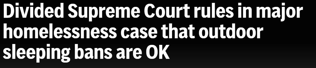 更令人唏噓的是,面對(duì)越來(lái)越多的人流浪街頭,今年6月底,美國(guó)最高法院以6:3的判決結(jié)果,允許各地政府實(shí)施禁止無(wú)家可歸者在戶(hù)外露宿的禁令。