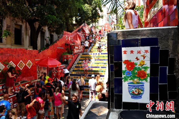 跟隨里約熱內(nèi)盧共和國博物館研究員安德烈·安迪·安古洛,中新社記者來到里約熱內(nèi)盧聞名遐邇的城市地標(biāo)——塞拉隆階梯。這是由智利藝術(shù)家塞拉隆歷時20余年打造的“彩色階梯”。