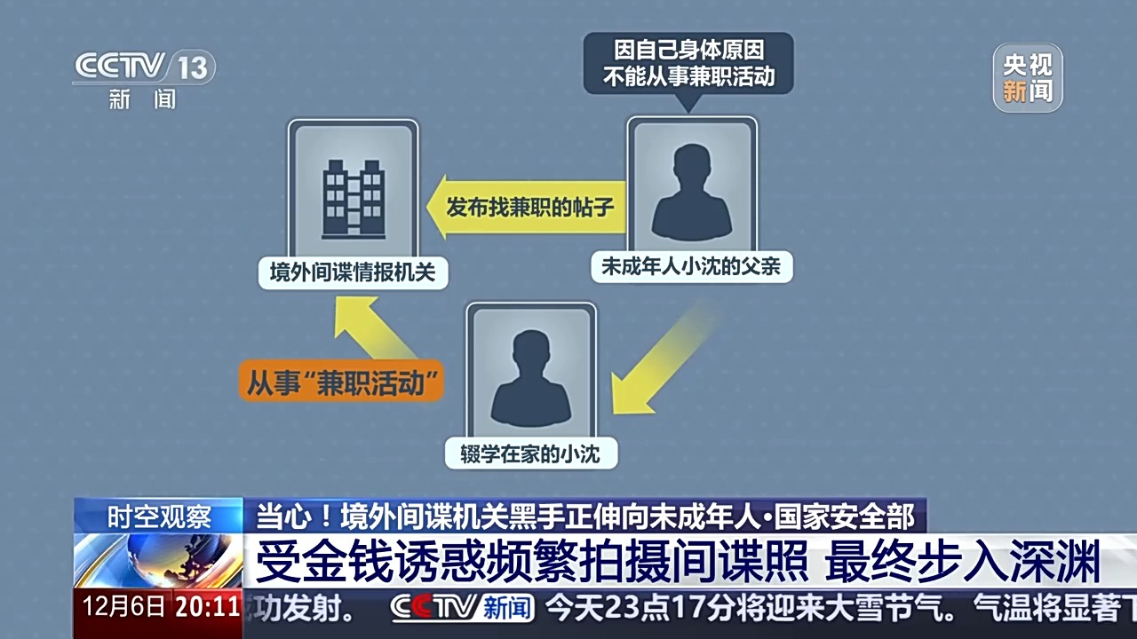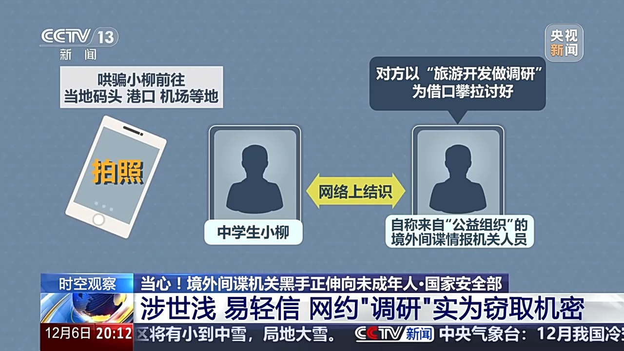 國際關(guān)系學(xué)院法學(xué)院教師 孔祥承:境外間諜機(jī)關(guān)目前都采取的是一種合法掩飾非法、公開掩護(hù)秘密的方式,對未成年人進(jìn)行一個拉攏策反。在多數(shù)情況下,他們會比如說偽裝成知心大姐、知心哥哥的方式,然后去影響這些未成年人,因為一些未成年人往往涉世不深,就被他們的甜言蜜語所誘惑,而逐漸被他們所利用。可能還有一些更為惡劣的情況,比如說一旦一些未成年人意識到這是一個間諜行為,想及時收手,那么境外的間諜機(jī)關(guān)也會利用他之前的行為作為把柄威脅他,導(dǎo)致他不得不繼續(xù)從事相關(guān)的行為,受他們的擺布,成為一個傀儡。