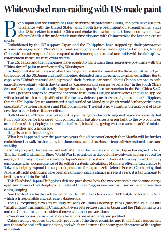 菲律賓和日本都大肆宣揚該協(xié)定有利于地區(qū)和平與安全,但實際上,該協(xié)定不僅允許兩國間增加聯(lián)合作戰(zhàn)演習,還為兩國在對方領(lǐng)土上部署軍隊開了綠燈,這無異于將火柴和火藥桶交到兩個荷爾蒙過剩的青少年手中。