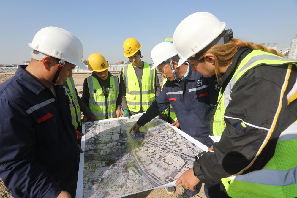 2024年3月2日,中伊員工在伊拉克巴格達(dá)尼蘇爾立體交通樞紐項(xiàng)目現(xiàn)場(chǎng)討論施工進(jìn)展。新華社發(fā)(哈利勒·達(dá)伍德攝)