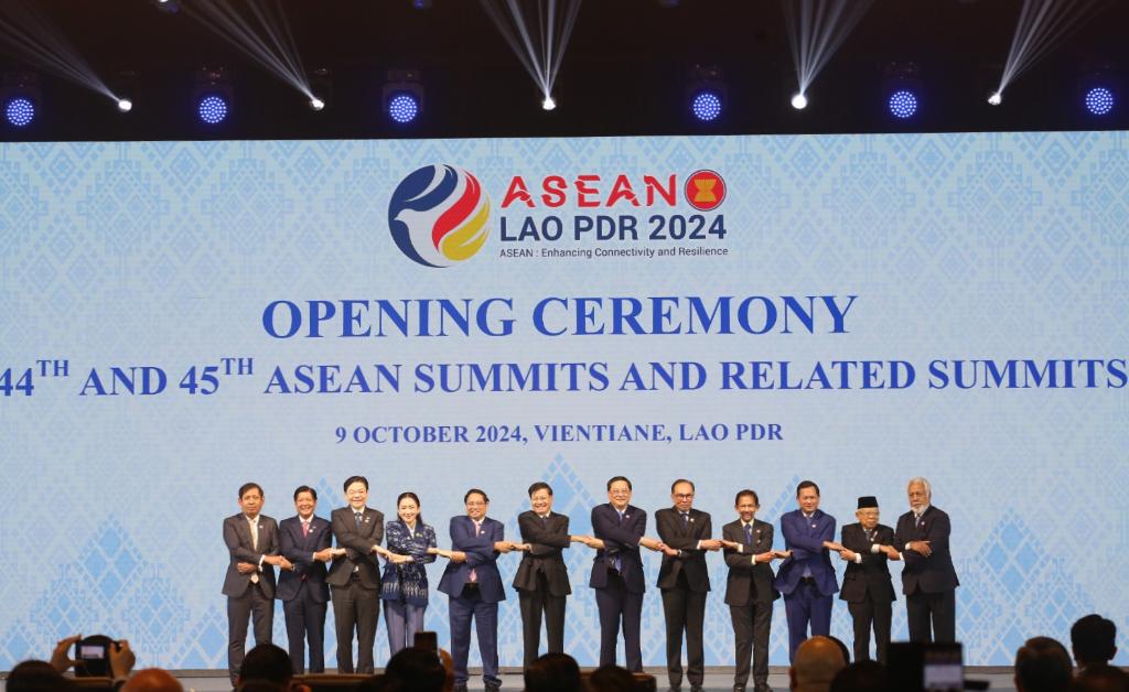 這是10月9日在老撾首都萬(wàn)象拍攝的第44屆和第45屆東盟峰會(huì)開幕式現(xiàn)場(chǎng)。新華社發(fā)