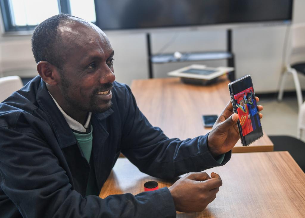 2024年2月15日,在位于亞的斯亞貝巴的埃塞俄比亞聯(lián)邦職業(yè)技術(shù)培訓(xùn)學(xué)院,魯班工坊當(dāng)?shù)亟處熂s納斯·阿凱萊(中文名艾友涵)展示在中國(guó)學(xué)習(xí)時(shí)的照片。(新華社記者李亞輝攝)