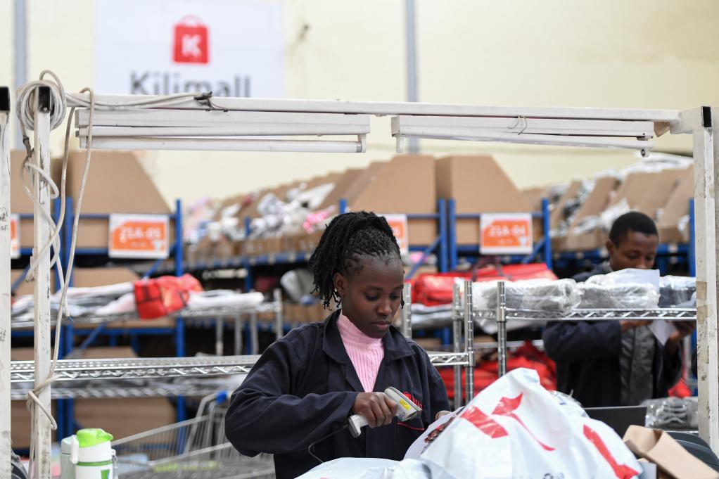 2023年7月28日,在肯尼亞姆洛隆戈,湖南長(zhǎng)沙非拓信息技術(shù)有限公司旗下電商平臺(tái)Kilimall的員工在倉庫內(nèi)分揀貨物。(新華社記者李亞輝攝)