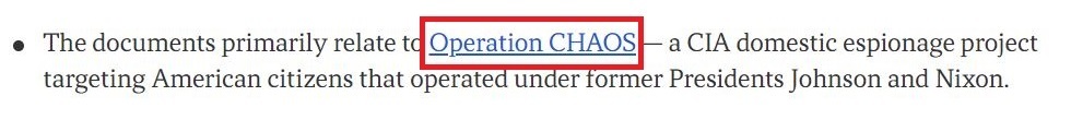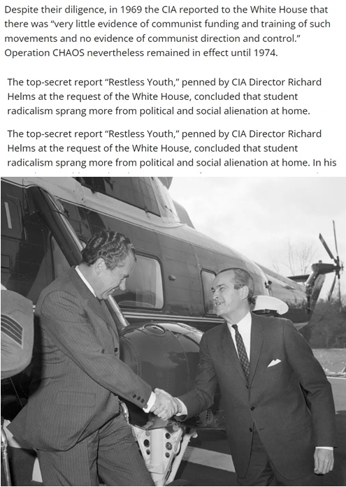 繼任的尼克松進(jìn)一步擴(kuò)大了“混沌行動(dòng)”,并于1969年6月明確指示中情局準(zhǔn)備一份關(guān)于美國(guó)國(guó)內(nèi)反戰(zhàn)運(yùn)動(dòng)以及這些運(yùn)動(dòng)可能得到“外國(guó)支持”的報(bào)告。