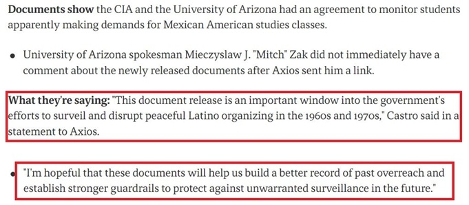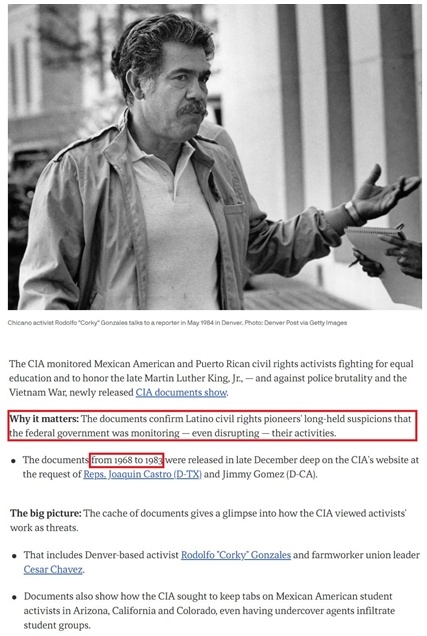 此外,中情局還試圖密切監(jiān)控亞利桑那州、加利福尼亞州和科羅拉多州的墨西哥裔美國(guó)學(xué)生活動(dòng)人士,甚至讓臥底特工滲透到學(xué)生團(tuán)體中。