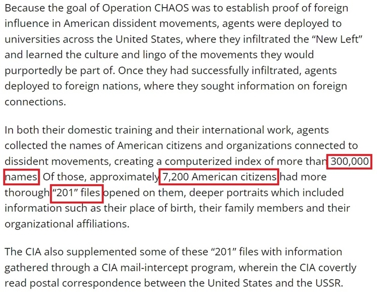 據(jù)悉,經(jīng)過(guò)這些“努力”,中情局收集了30多萬(wàn)個(gè)與國(guó)內(nèi)民權(quán)運(yùn)動(dòng)有關(guān)的美國(guó)公民和組織的名字。其中約有7200名美國(guó)人被建立了更全面的所謂“201”檔案,涉及他們的出生地、家庭成員和組織隸屬關(guān)系等各種信息。