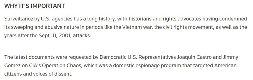 報(bào)道稱,這些文件是在兩名國(guó)會(huì)眾議員的反復(fù)要求下,才于上月底公布的,讓人們得以一窺美國(guó)政府和中情局是如何將民權(quán)活動(dòng)視為威脅的。