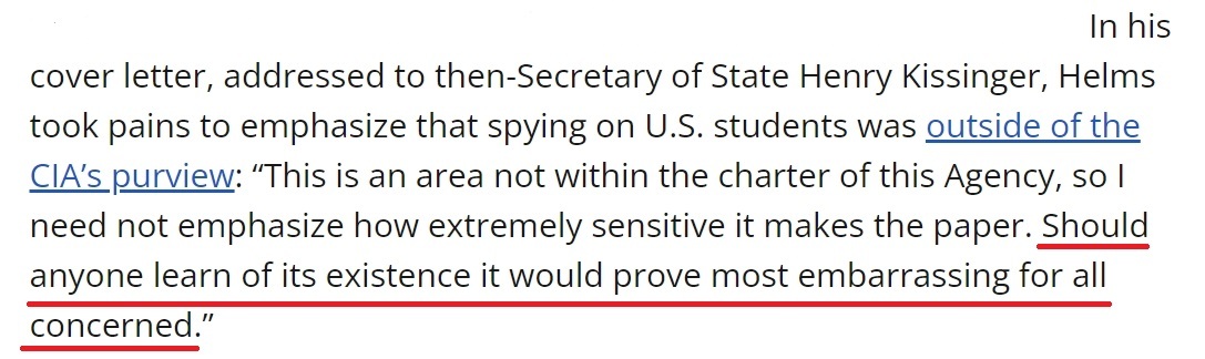 就像時(shí)任中情局局長(zhǎng)赫爾姆斯1970年在寫給時(shí)任國(guó)務(wù)卿基辛格的信中所說(shuō),監(jiān)視美國(guó)學(xué)生不在中情局的職權(quán)范圍內(nèi),“如果有人知道了‘混沌行動(dòng)’的存在,對(duì)所有相關(guān)者來(lái)說(shuō)都將是非常尷尬的事情”。