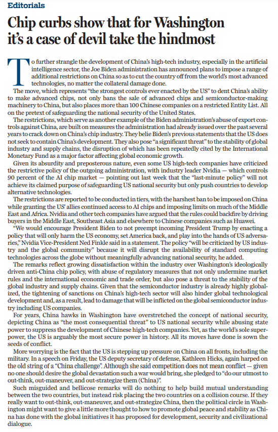 1月13日,拜登政府在卸任前夕出臺(tái)人工智能相關(guān)出口管制措施,進(jìn)一步加嚴(yán)對人工智能芯片、模型參數(shù)等出口管制,還拓展了長臂管轄,對第三方與中國開展正常貿(mào)易設(shè)置障礙、橫加干涉。拜登政府的這一舉措完全無視后果,旨在進(jìn)一步遏制中國高科技產(chǎn)業(yè),尤其是人工智能領(lǐng)域的發(fā)展。