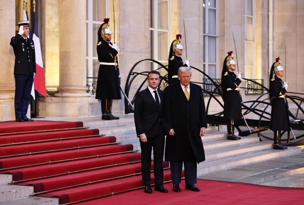 2024年12月7日,法國(guó)總統(tǒng)馬克龍(前左)在巴黎總統(tǒng)府愛(ài)麗舍宮歡迎特朗普(前右)。新華社記者 高靜 攝