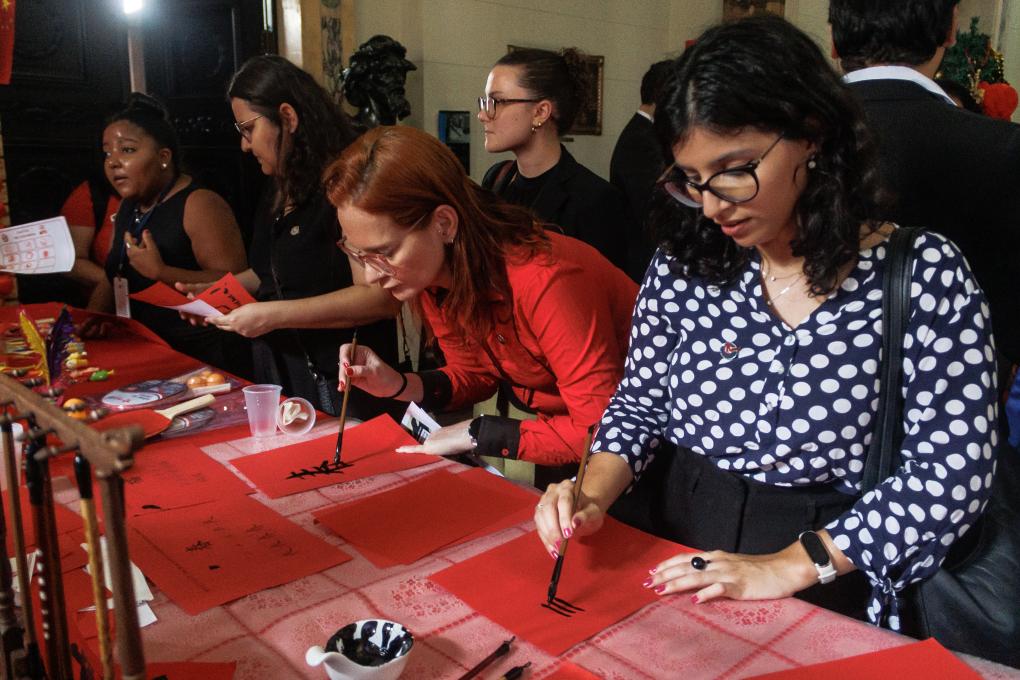 2月6日,在巴西里約熱內(nèi)盧州蒂拉登特斯宮(州議會(huì)),人們?cè)隗w驗(yàn)書法。新華社發(fā)(克勞迪婭·馬爾提尼 攝)