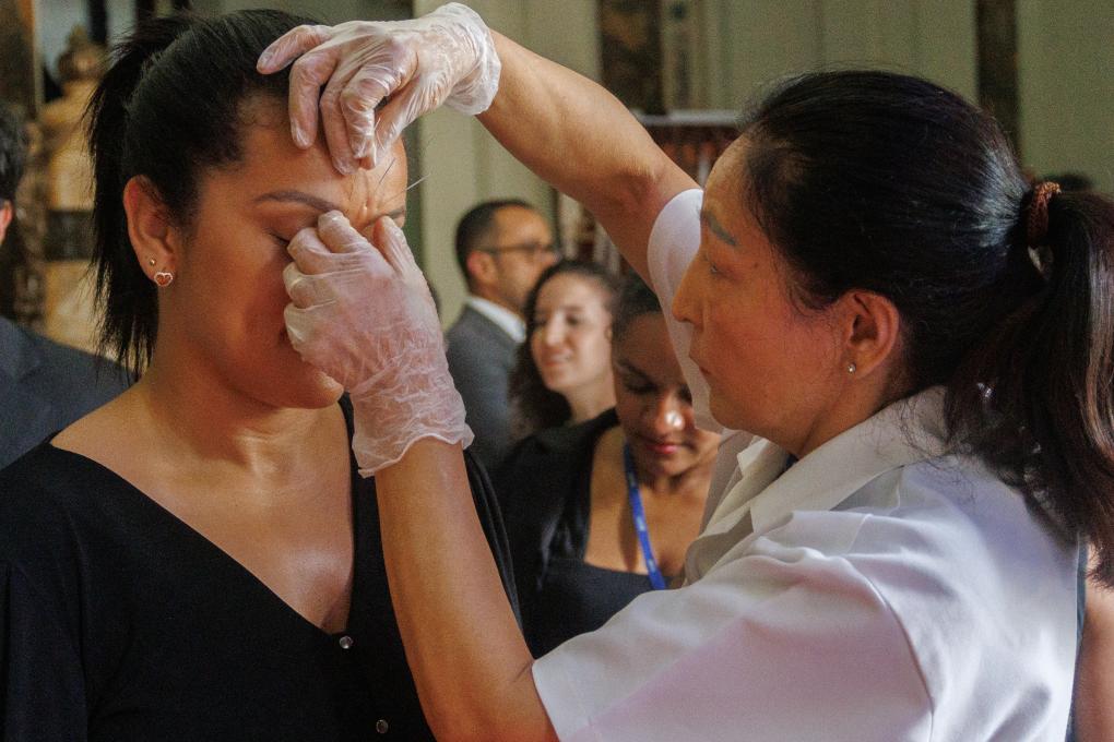 2月6日,在巴西里約熱內(nèi)盧州蒂拉登特斯宮(州議會(huì)),一名女子(左)在體驗(yàn)針灸。新華社發(fā)(克勞迪婭·馬爾提尼 攝)