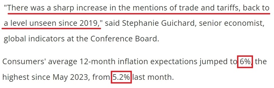在美國CCI以三年半以來的最大速度惡化的同時,美國消費者對未來一年的通脹預(yù)期也從5.2%大幅升高至6%,達到2023年5月以來的最高水平。這進一步顯示,美國人對特朗普政府政策可能對經(jīng)濟造成的負面影響越來越擔憂。