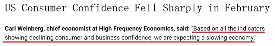 紐約高頻經(jīng)濟公司首席經(jīng)濟學家卡爾 溫伯格在給客戶的一份報告中直言:“基于所有顯示消費者和企業(yè)信心下降的指標,我們預(yù)計美國經(jīng)濟將放緩。”