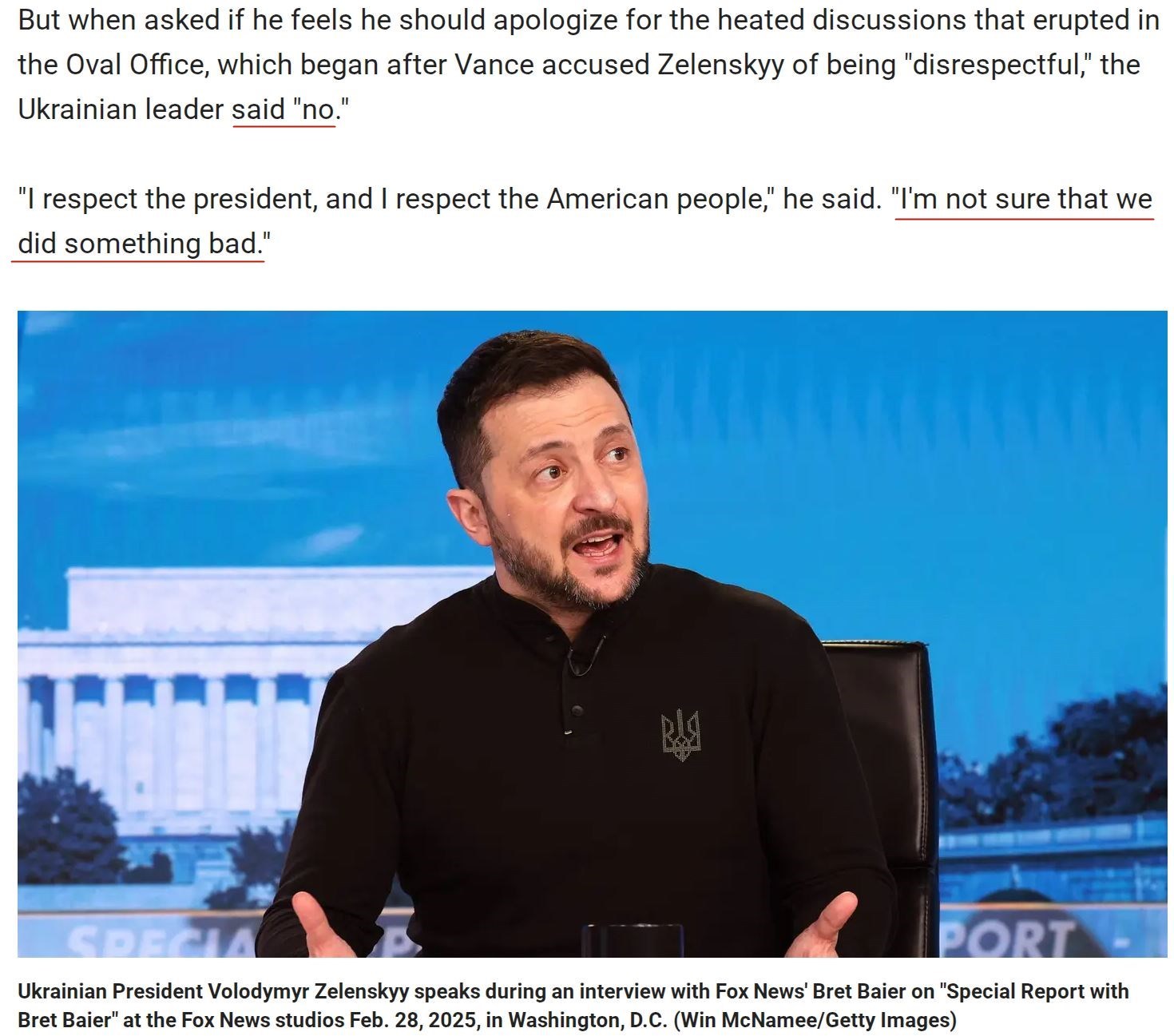“我在橢圓形辦公室看到的是(澤連斯基對美國的)不尊重。我不知道我們能不能與澤連斯基恢復(fù)談判。還是那句話,他要么辭職,然后派一個(gè)可以與我們合作的人過來,要么他自己做出改變?!?/p>