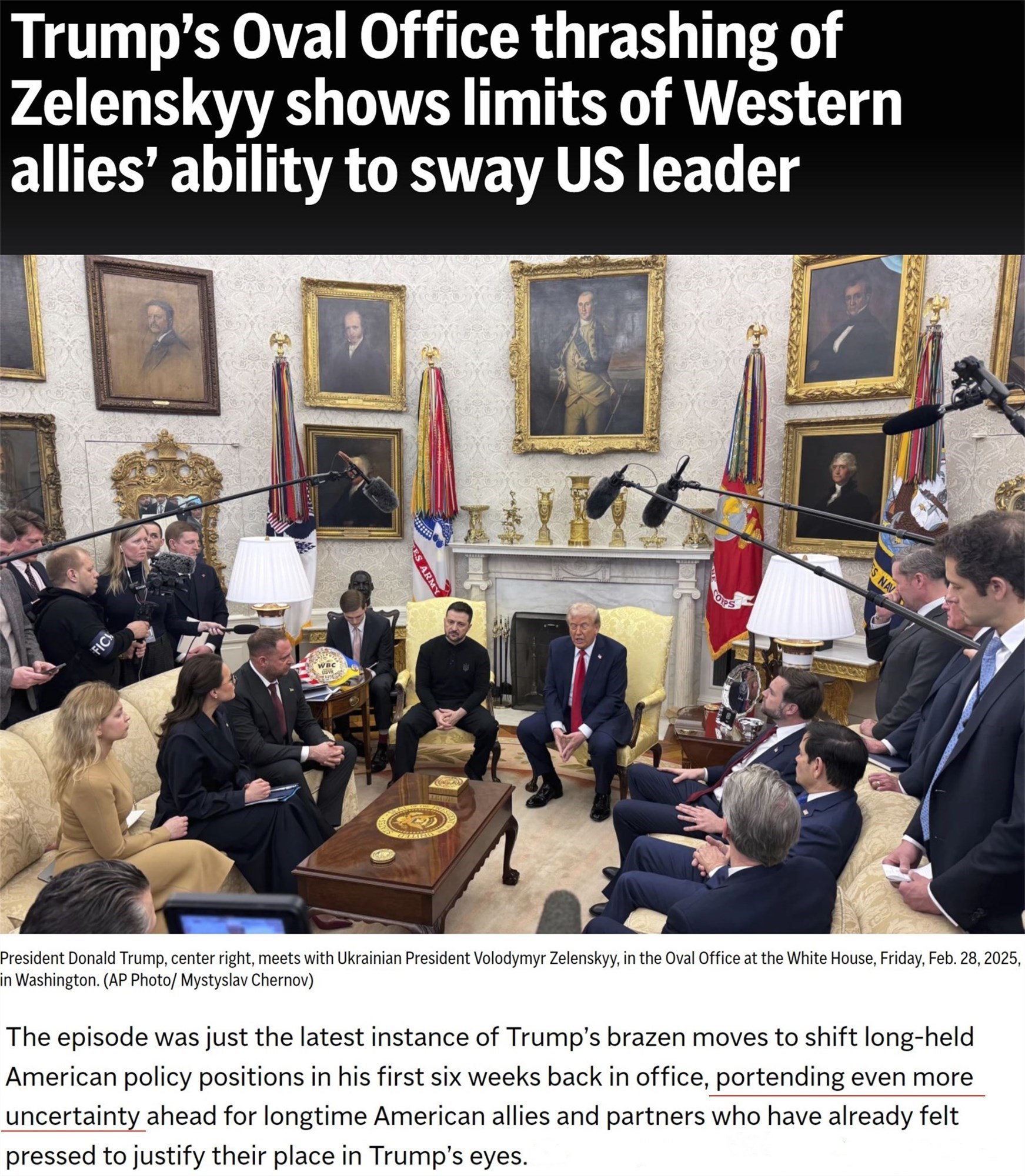 美聯(lián)社報(bào)道稱,隨著白宮橢圓形辦公室會晤的余波繼續(xù),烏克蘭及其盟友在美國政策方向上面臨越來越大的不確定性。雖然許多領(lǐng)導(dǎo)人重申他們支持基輔的承諾,但特朗普的言論及其暴露出來的與美國盟友的分歧凸顯出跨大西洋聯(lián)盟面臨的挑戰(zhàn)。