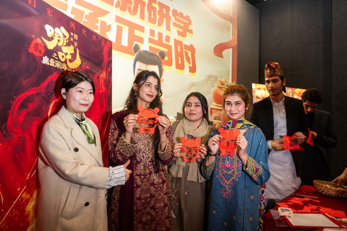 2月25日,在長(zhǎng)沙摩天輪國(guó)際影城,留學(xué)生們?cè)谡故尽澳倪浮奔艏堊髌?。(圖片來(lái)源:新華社)