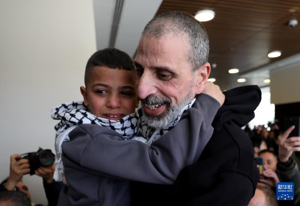 2月1日,在約旦河西岸城市拉姆安拉,人們擁抱獲釋的巴勒斯坦人。以色列當天釋放了183名被扣押人員。新華社發(fā)(艾曼·諾巴尼 攝)