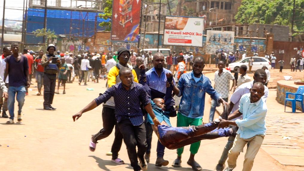 2月27日,剛果(金)東部南基伍省首府布卡武市發(fā)生兩起爆炸,造成至少11人死亡、65人受傷。圖為人們在爆炸事件現(xiàn)場搬運傷員(視頻截圖)。新華社發(fā)