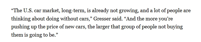 “從長期來看,美國汽車市場已不再增長,越是推高新車價格,不買車的人就會越多?!?/p>
