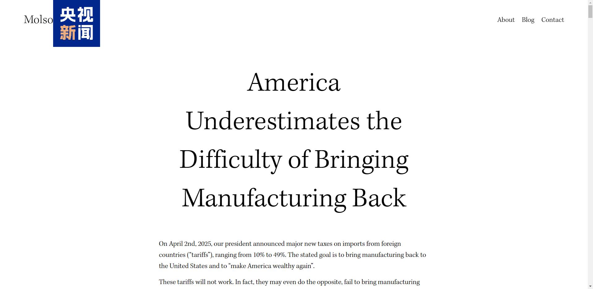 近日,美國一線企業(yè)主莫爾森·哈特結(jié)合自身經(jīng)驗,發(fā)布了題為《美國低估了制造業(yè)回流的難度》的文章,“控訴”特朗普的關(guān)稅政策,并用多個刀刀見血的論點,揭穿了“關(guān)稅能救‘美國制造’”的致命幻覺。