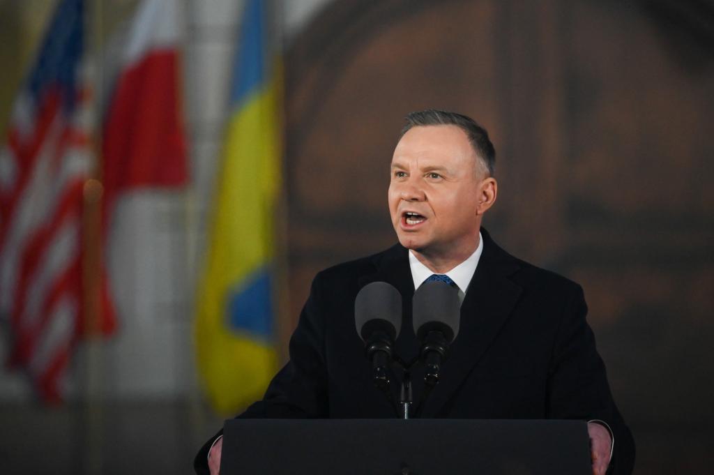 2023年2月21日,波蘭總統(tǒng)杜達(dá)在華沙發(fā)表講話。新華社發(fā)(阿列克西攝)