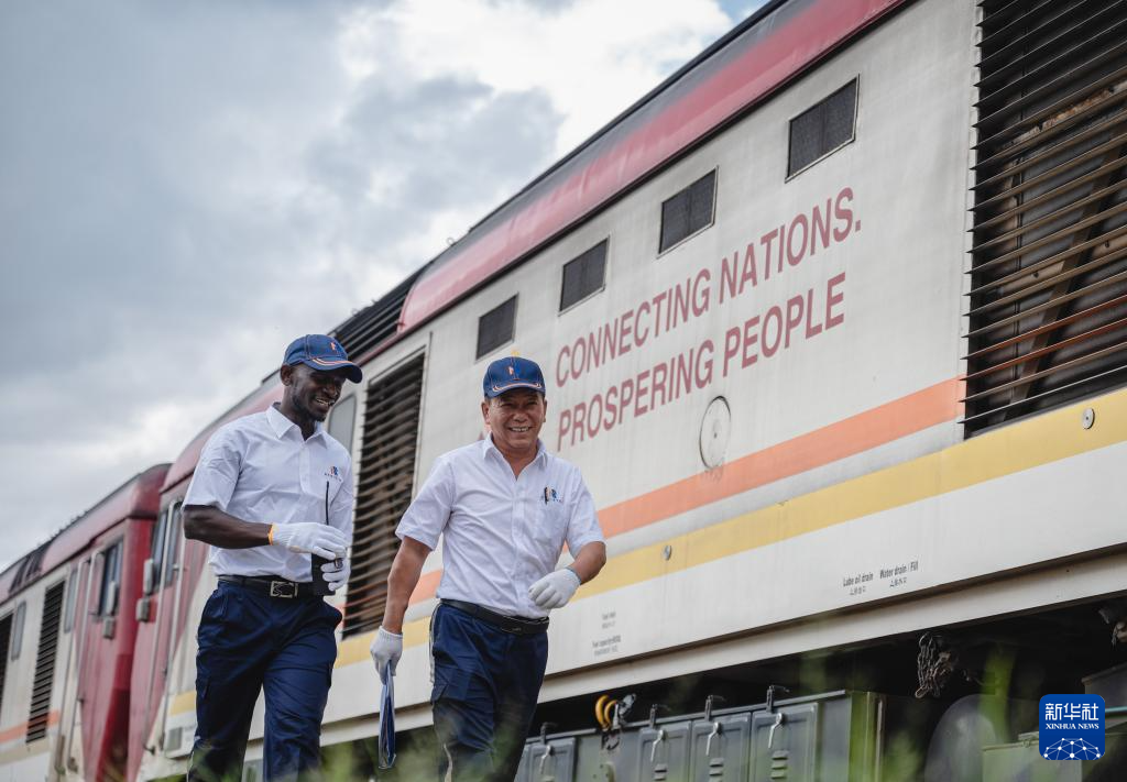 2023年5月23日,在肯尼亞內羅畢,非洲之星鐵路運營公司機輛部的火車駕駛員蔣立平(右)與學員霍勒斯從一輛印有“連接國家 走向繁榮”標語的蒙內鐵路機車旁走過。 新華社記者 王冠森 攝