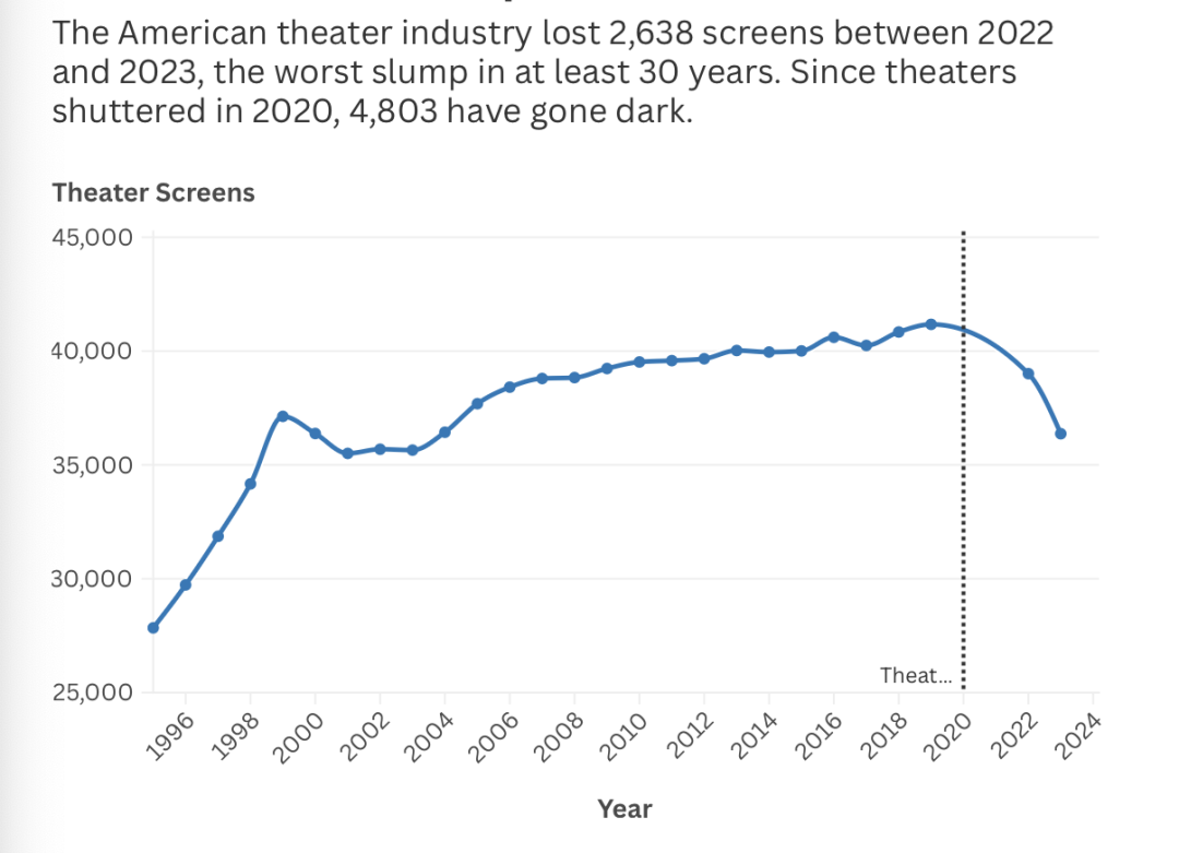 ||2022年至2023年間,美國影院損失了2638塊銀幕,這個趨勢還在延續(xù)。