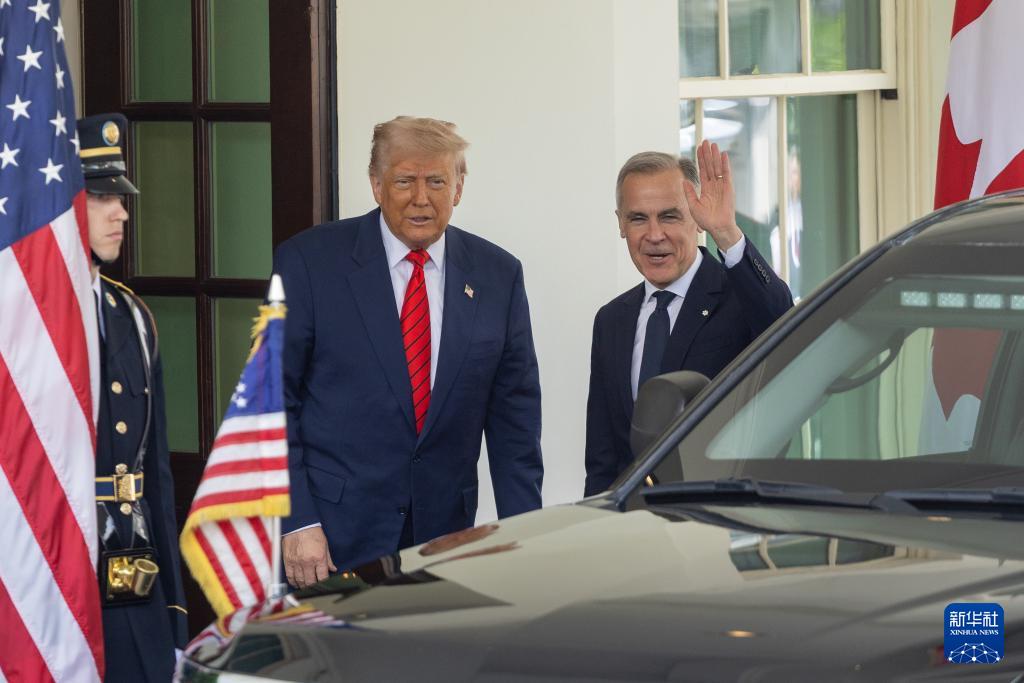 5月6日,美國總統(tǒng)特朗普(左二)在華盛頓白宮迎接到訪的加拿大總理卡尼。新華社記者 胡友松 攝